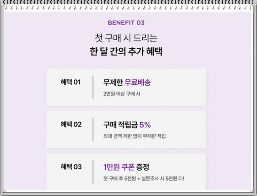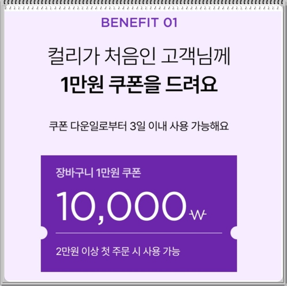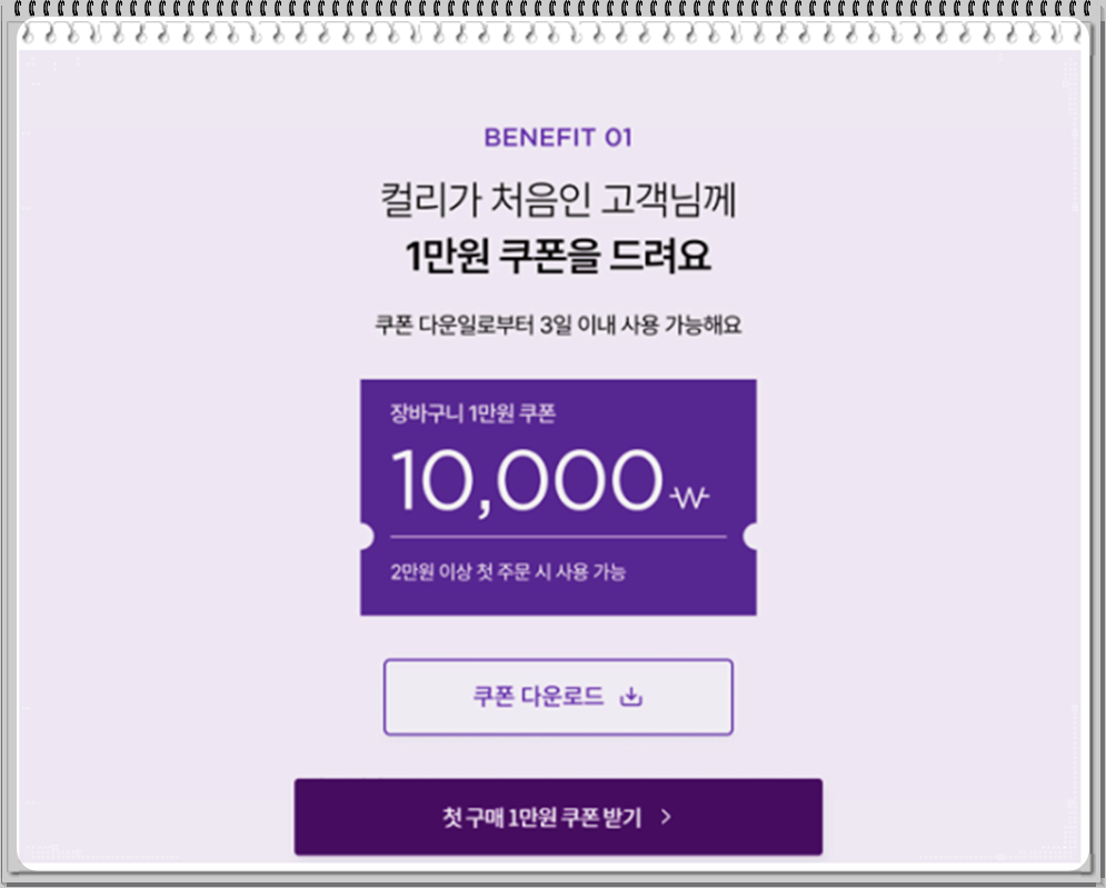 마켓컬리는 신규 회원에게 다양한 혜택을 제공합니다. 첫 번째로 웰컴 할인 쿠폰이 있습니다. 첫 구매 시 50% 할인 쿠폰을 통해 최대 1만 원을 할인받을 수 있습니다. 이를 통해 2만 원어치의 장바구니를 채우면가장 좋은 조건으로 쇼핑이 가능합니다. 할인쿠폰은 신규 회원에게만 제공되므로, 회원가입과 동시에 받으셔야 합니다.