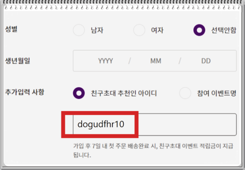 마켓컬리를 처음 이용하는 분이라면 추천인 코드 입력을 잊지 말아야 합니다. 추천인 ID를 입력하면 첫 구매 시 1만 원의 적립금이 주어지기 때문이죠. 추천인 ID 'dogudfhr10'을 가입 시 입력하면 기존에 받는 5천원이 아닌 1만 원을 받을 수 있어 매우 유용합니다. 회원가입 시 "추가입력사항"에서 추천인 ID를 입력한 뒤 꼭 확인 버튼을 눌러주세요. 확인을 하지 않으면 혜택을 놓칠 수도 있으니 주의가 필요합니다.