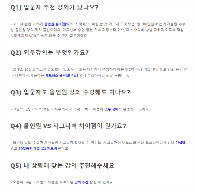 아백 강의의 가장 큰 장점 중 하나는 수강료에 비해 매우 높은 질의 교육을 제공한다는 점입니다. 아로스님은 에드센스 블로그 수익을 내기 위한 필수적인 부분들을 상세하게 설명해 주셨습니다. 실제로 블로그를 운영하면서 알아두어야 할 스킬들이 정리되어 있어, 처음 시작하는 사람도 쉽게 이해할 수 있었습니다. 강의는 초보자부터 고수까지 각 단계별로 나뉘어져 있어, 자신에게 맞는 내용을 실전에서 유용하게 적용할 수 있었습니다.